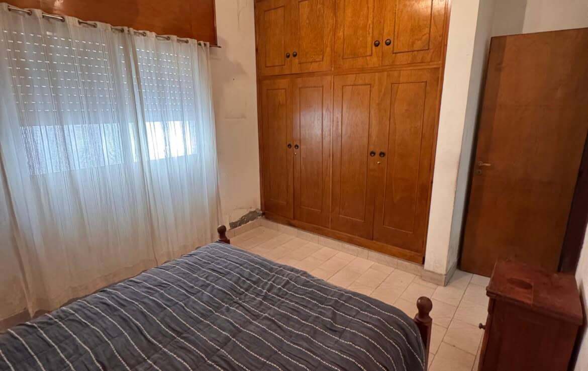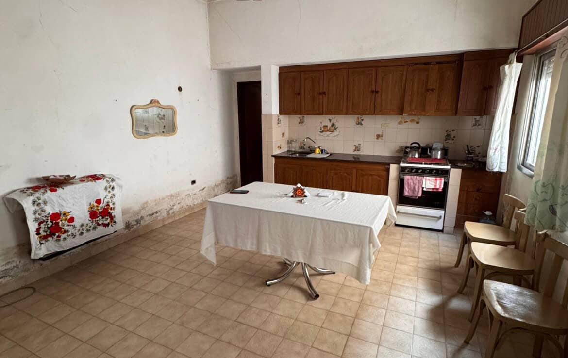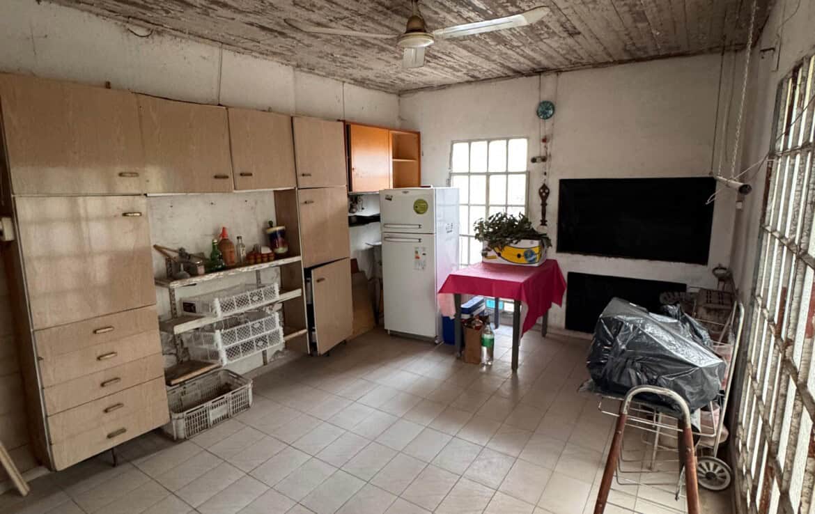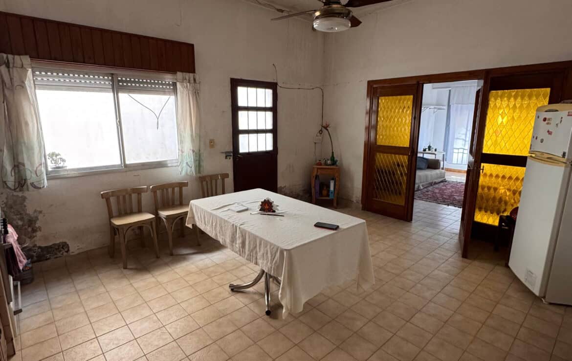 Casa con living amplio, cocina comedor, baño, dos dormitorios con placares, otra dependencia o dormitorio con baño lavadero, quincho con cocina y fogon, patio trasero, gge y patio pasante. –